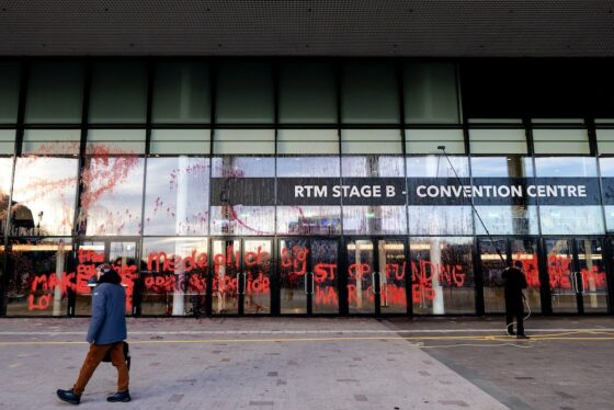 Demonstrators daub Rotterdam arms fair entrance with fake blood